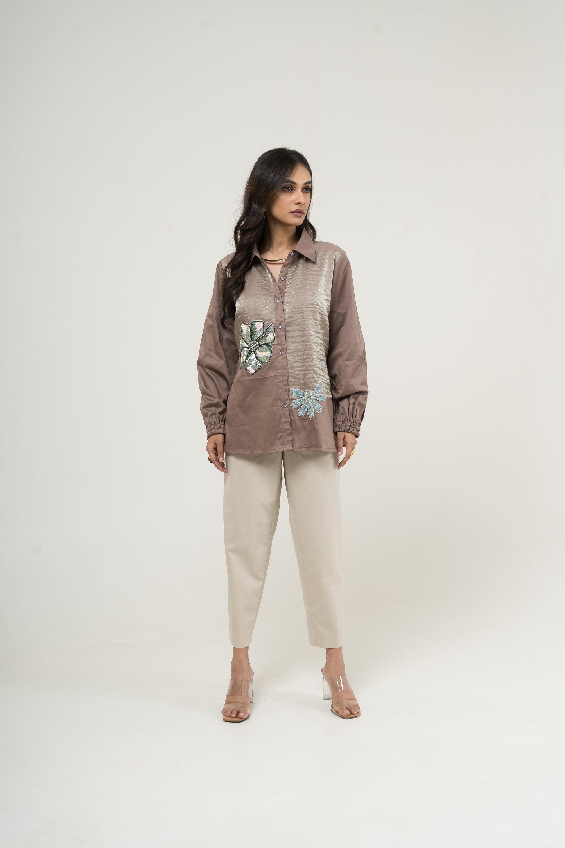 Where earthy meets elegant — the Desert Bloom Embroidered Shirt features a warm taupe base with a play of matte and lustrous textures. Crafted in soft cotton, this full-sleeve button-down shirt showcases a unique panel of shimmer fabric adorned with hand-embroidered floral appliqués in pastel greens and blues. The relaxed silhouette and gathered cuffs make it a versatile piece for both workwear and weekend glam.