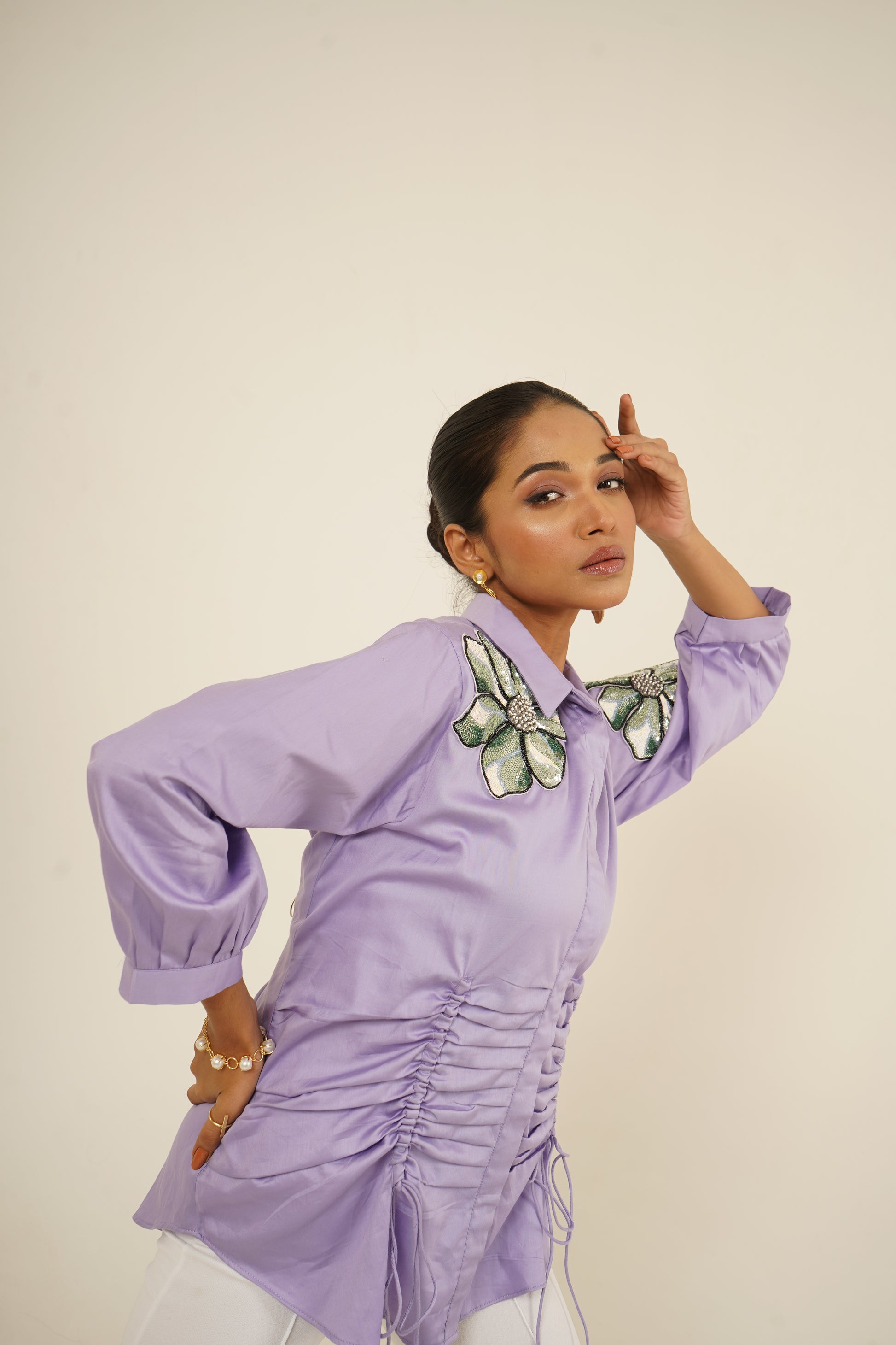 Feminine with a touch of flair, the Lilac Petal Ruched Shirt blends soft structure with playful volume. Crafted in a pastel lilac cotton, this standout shirt features dramatic ruched drawstring detailing on the front and shimmering hand-embroidered floral appliqués on each shoulder. Full sleeves with pleated cuffs add balance to the sculpted silhouette, making it a versatile choice for elevated daywear or chic evening transitions.