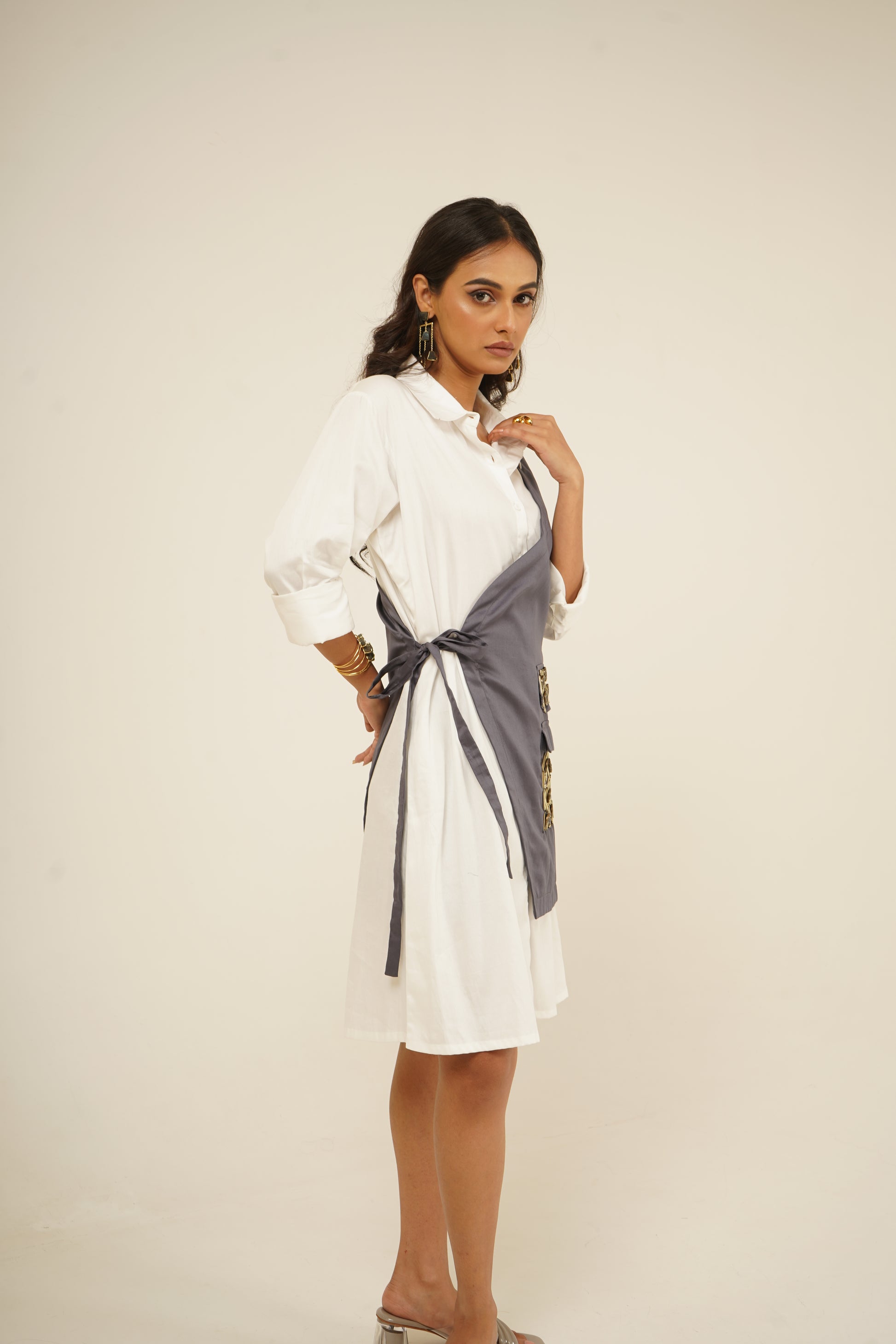 Redefine modern layering with our Dual Tone Drape Shirt Dress. Featuring a crisp white cotton shirt base and an attached draped overlay in deep slate grey, this knee-length dress blends classic tailoring with asymmetrical sophistication. Embellished utility-style patch pockets add texture and shine, making it a statement piece for those who love structured minimalism with an artistic edge.